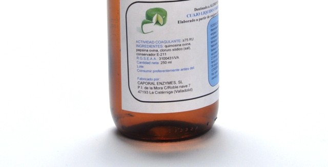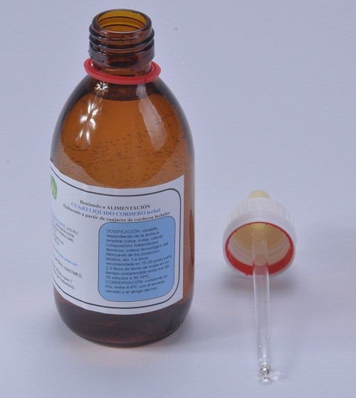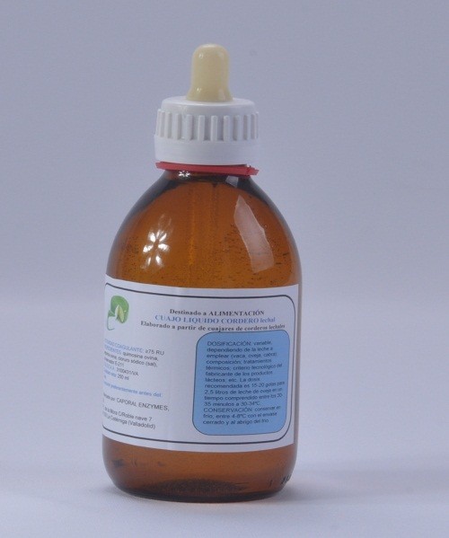 Extract liquid rennet lamb. Container 250 ml. with dispenser. Milk clotting enzyme of animal origin 100% ovine origin of the lamb, and Castilian churro breeds Spanish origin.