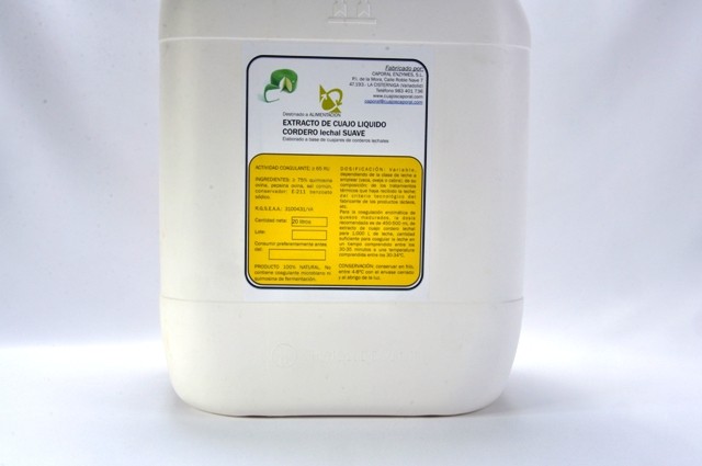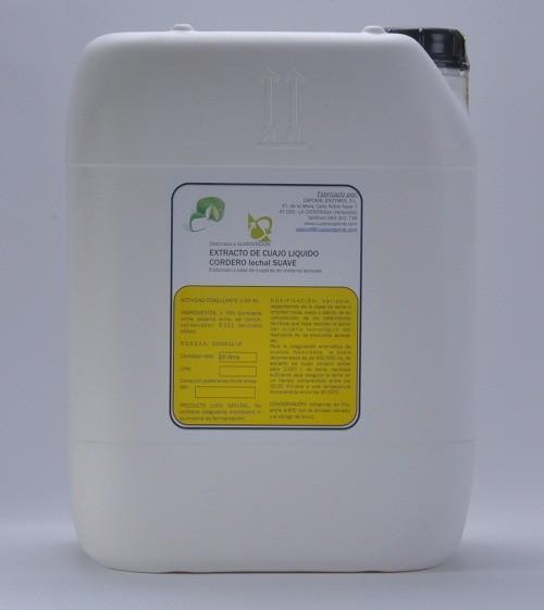 Extracto de cuajo líquido cordero lechal suave. Envase 20 litros. Enzima coagulante de leche de origen 100% animal de procedencia ovina, de las razas lechazo, churro y castellano, origen español (Castilla y León).
